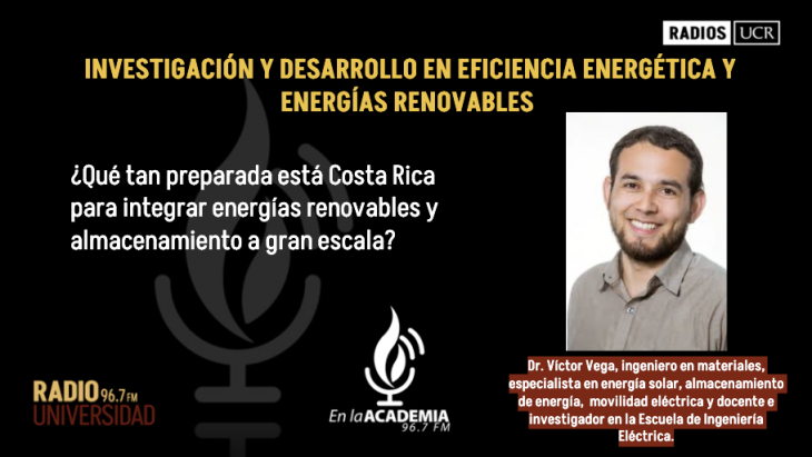 Resumen: El Dr. Víctor Vega, ingeniero en materiales y especialista en energía solar, almacenamiento de energía y movilidad eléctrica, conversa sobre el trabajo de la Red de Investigación y Desarrollo en Eficiencia Energética y Energías Renovables. A lo largo del programa se analizan los principales desafíos de adaptar modelos internacionales al contexto costarricense, los avances metodológicos alcanzados, así como los aportes en herramientas prácticas como el análisis de sombras para instalaciones solares. También se abordan temas clave como el rol de las microredes, la preparación del país para la integración de baterías a gran escala y las verdades y mitos alrededor de la afirmación de Costa Rica como país 100% renovable. Finalmente, se exploran las próximas líneas de investigación que buscan consolidar una transición energética más robusta y sostenible.