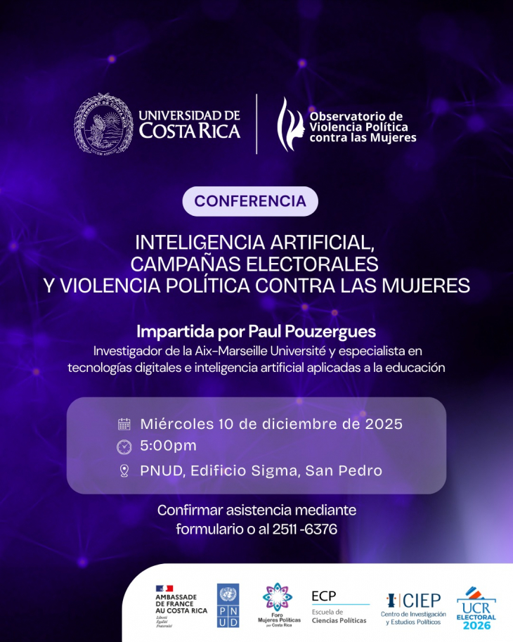 El Observatorio de la Violencia Política contra las Mujeres del CIEP de la Universidad de Costa Rica, le invita a la conferencia "Inteligencia Artificial, Campañas Electorales y Violencia Política contras las Mujeres", impartido por Paul Pouzergues, investigador de la Aix-Marseille Université y especialista en tecnologías digitales e inteligencia artificial aplicadas a la educación.